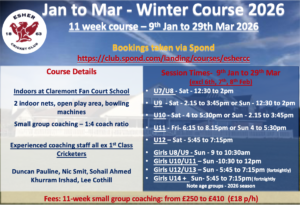 We are pleased to confirm that Esher CC will be running 11 weeks of indoor cricket courses from Jan to the end of March 2026.