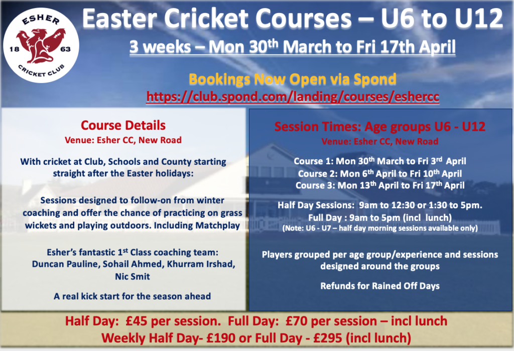 With cricket at Schools, Club and County starting straight after the Easter holidays, the above courses are designed to offer young cricketers the chance of practicing on grass wickets, playing again in outdoor conditions and gain greatly from Esher’s fantastic coaching team. A real kick start for the season ahead.