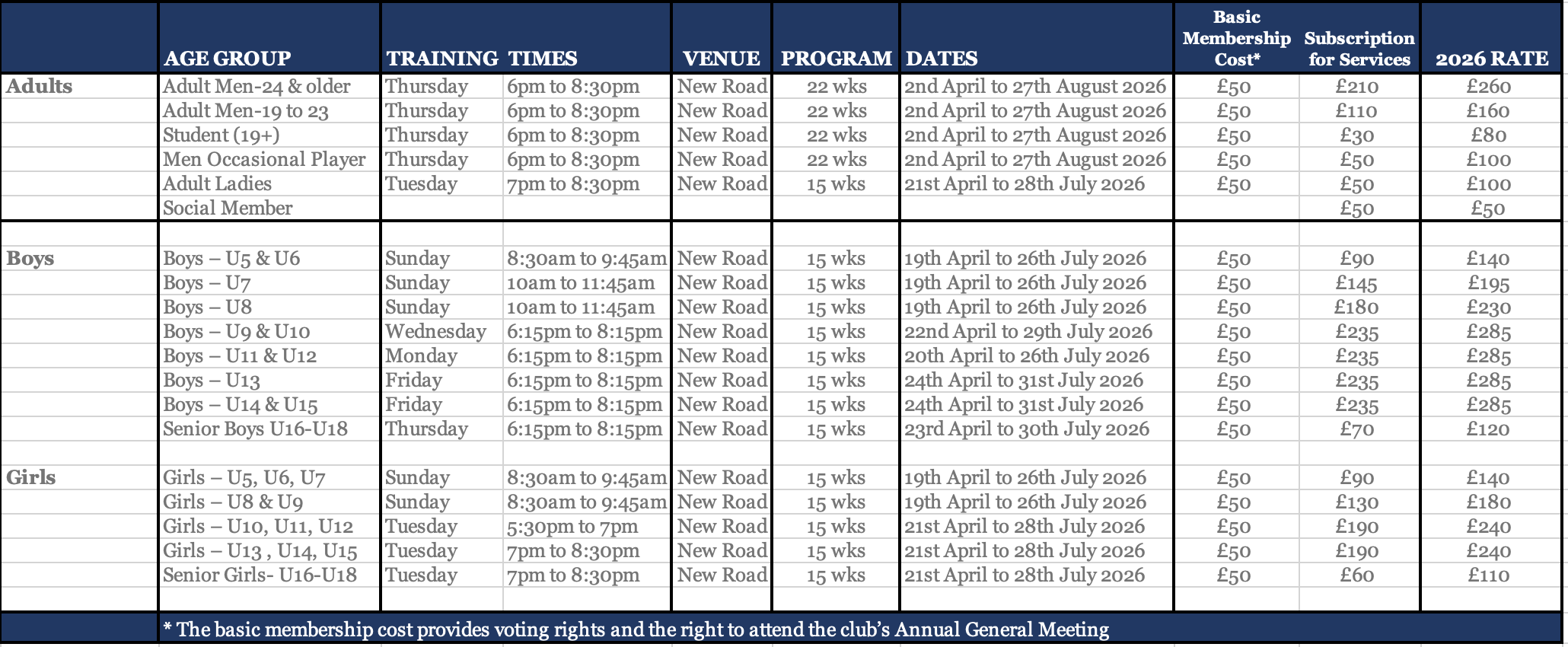 Membership Rates and Training Times for 2026